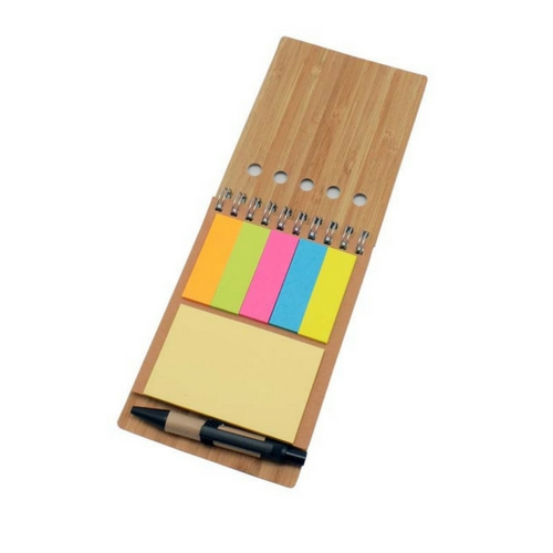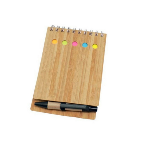 Anotador espiral símil madera contiene 60 hojas recicladas. Incluye Post it y bolígrafo mini