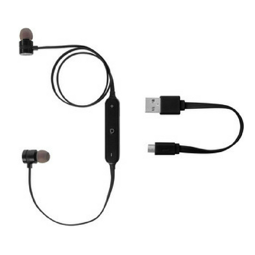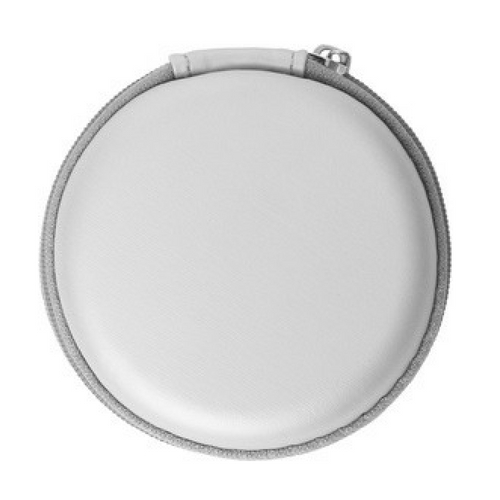 Auriculares Bluetooth. Botones para encendido, avance y retroceso de canciones. Opción de responder y cancelar llamadas entrantes con el botón de encendido. Cable de 52 cm. aprox. Cable USB para carga. Estuche redondo de eva pouch con interior de tela y un bolsillo de red con cierre