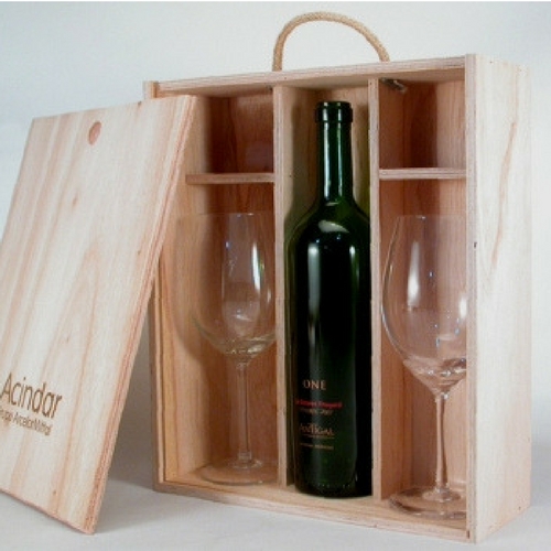 Caja de multilaminado de paraiso natural para 1 vino y 2 copas