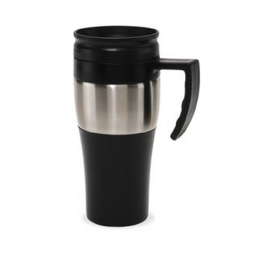 Capacidad 380 ml. Metal y plástico. Interior plástico. Exterior plástico y metálico. Con asa plástica