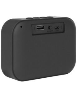 Parlante bluetooth. En la parte superior tiene botones de modo, volumen y play. Con el botón Modo se elige entre las opciones de Bluetooth y USB. Opción de responder llamadas desde el parlante pulsando una vez el botón Play cuando entra la llamada. Base con detalles antideslizantes. Alcance de transmisión hasta 10 mts. Voltaje DC 5V. Incluye cable USB para carga. Material: Plástico engomado y tela. Medidas: 11 x 8 x 4 cm.