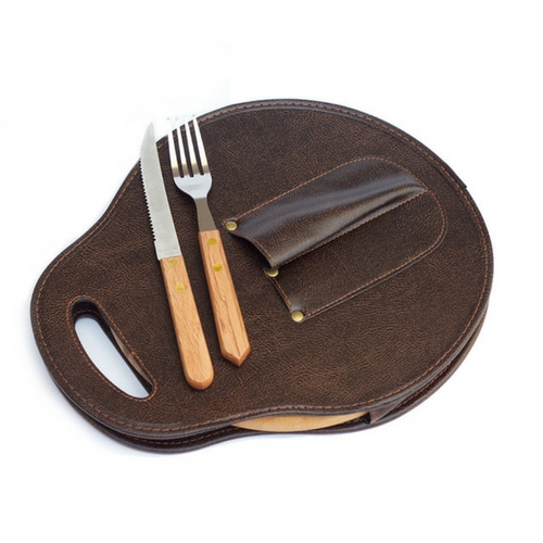 Incluye plato de bamboo con decantador, juego de cubiertos (cuchillo y tenedor) con mango de madera y un contenedor del set en cuero ecológico marrón, cuyo formato se asemeja a un estribo para caballo