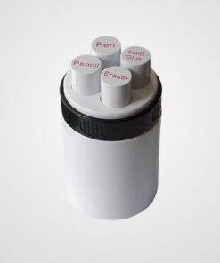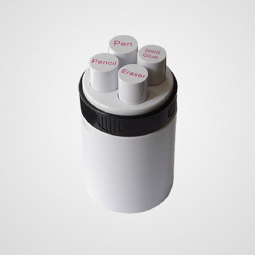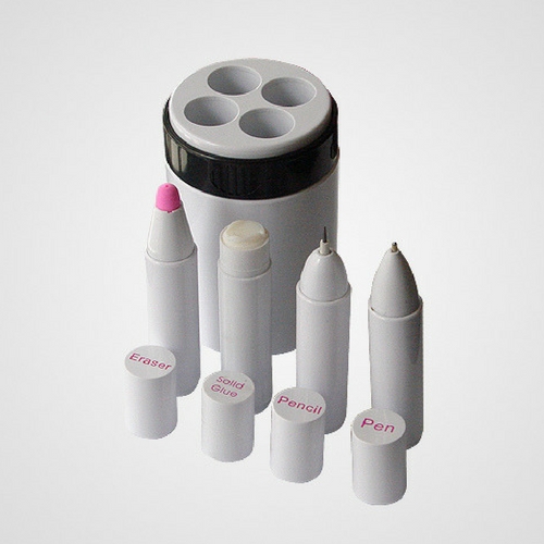 Set de escritorio compuesto de bolígrafo, lápiz, goma de borrar y pegamento en barra.