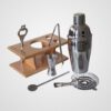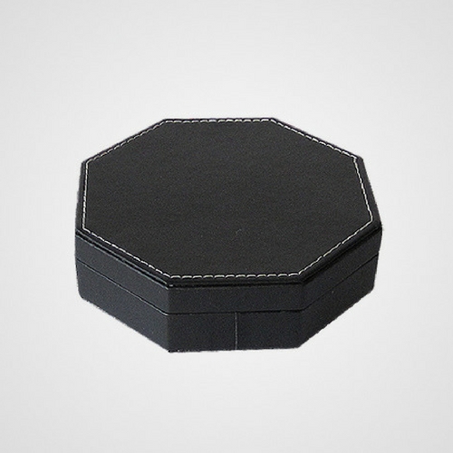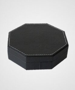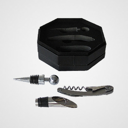 Tres piezas en caja de simil cuero octogonal, contiene un destapador metálico, un tapón metálico y pico vertedor